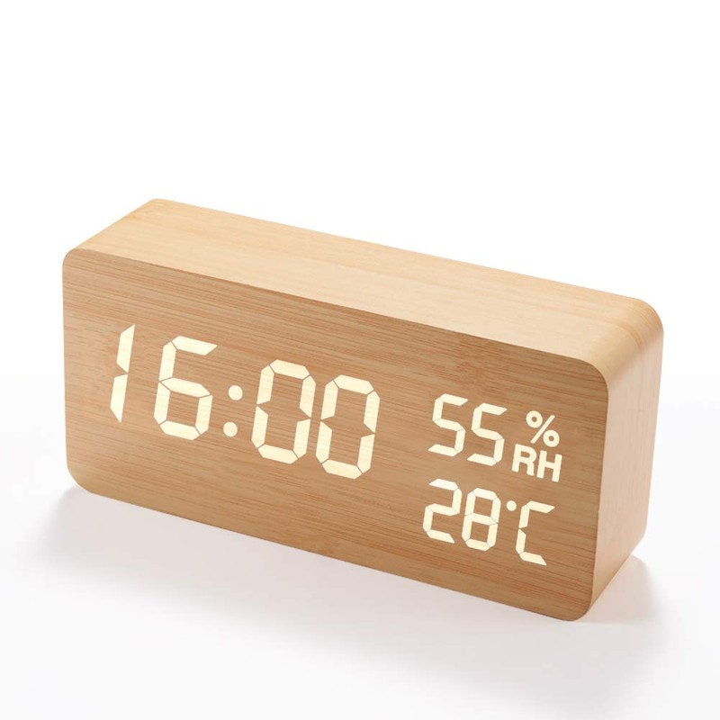 Alarm Clock, Loud Volume, Digital Table Clock, Thermometer/Hygrometer, Tabletop, Stylish, Wood Grain Style, Voice Detection, Power Saving, USB Power, Gift (Wood Grain Style)