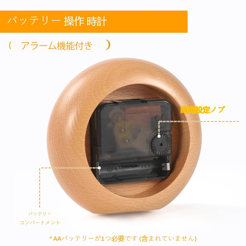 [Alarm Function] Beech Wood, Completely Quiet, 4.33 Inches, Solid Wood, Table Clock, Cattepote, Scandinavian Style Round Clock, Multi Settings, Office, Bedroom, Living Room, Gift (Beech Wood)