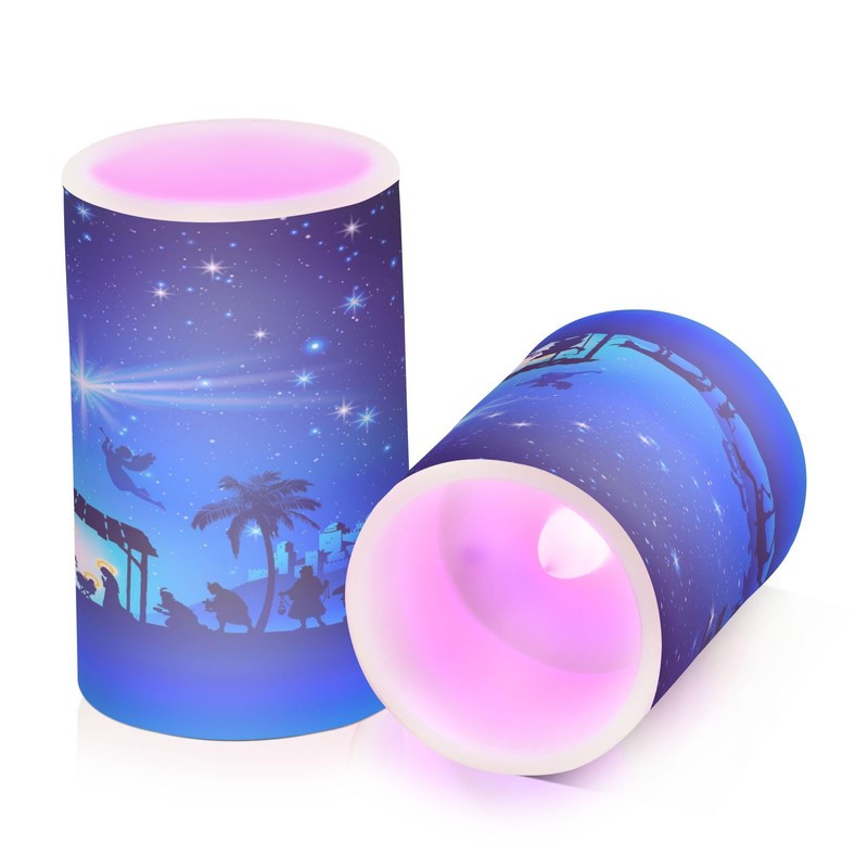 ALAZA Christmas Blue Nativity Scene Flickering Flameless Candles Battery Operated with Remote Timer,Tea Light Candles LED Pillar Votive Candles Set of 2 for Outdoor Indoor Decorations