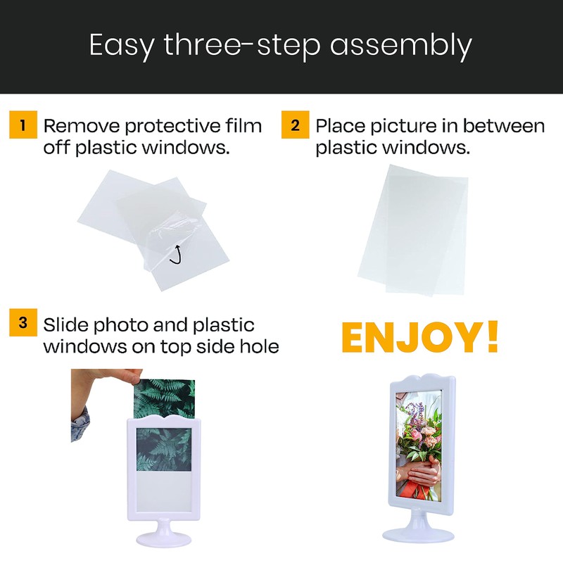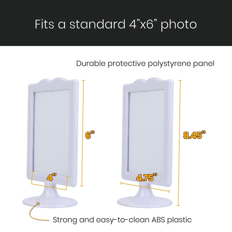 - DURABLE AND EASY TO USE - Change photos quickly while using our vertical standing plastic picture frames 4x6 by sliding the front panel upwards and inserting desired prints. This fillable photo frame is made with high-quality ABS plastic with a protective Polystyrene front panel that is durable and easy to clean using a dry cloth.