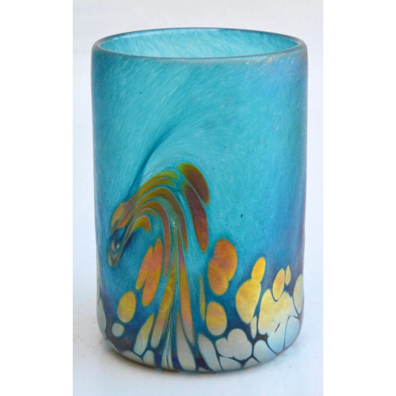 This is a gorgeous Aqua Marine drinking glass with gold wave design. Stands at 4.5" h by 3" w.  Made by Glass Master Saul Alcaraz in 2017. Code AM03