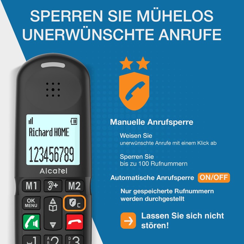 - BLOCK UNWANTED CALLS: Block up to 100 unwanted numbers easily at the touch of a button. In automatic mode, only calls from saved contacts are allowed. Anonymous calls are reliably completely blocked.