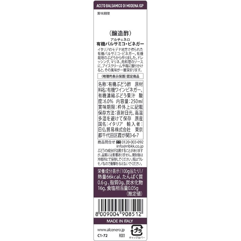 - Ingredients: Organic Wine Vinegar (Italy), Organic Concentrated Grape Juice (Italy). Contents: 8.5 fl oz (250 ml). Country of Origin: Italy