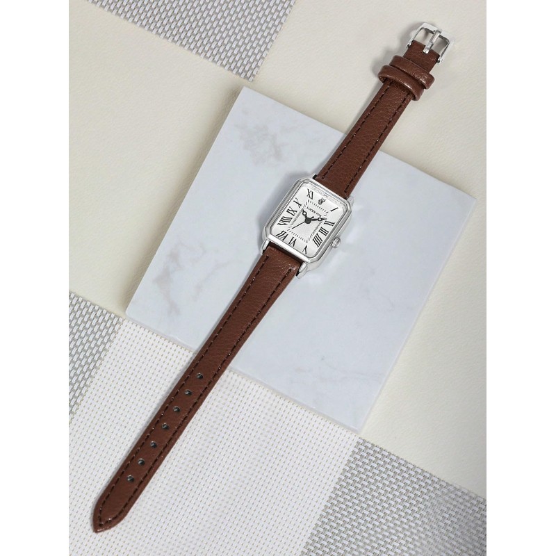 ALCENTIS Women's Rectangular Watch, White Dial, Roman Numerals, Leather Strap, Silver Chrome Case, Brown Strap - Chrome Case, Stylish
