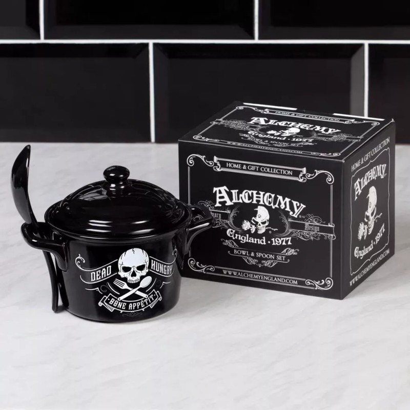Alchemy Gothic China MRB3 Bone Appetit Bowl Lid & Spoon Set Oven Microwave Skull
