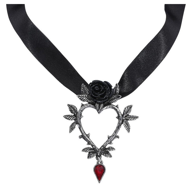 - A heart-shaped garland pendant formed from pewter rose stems and leaves embellished with a black resin rose flower and a red Austrian crystal dropper
