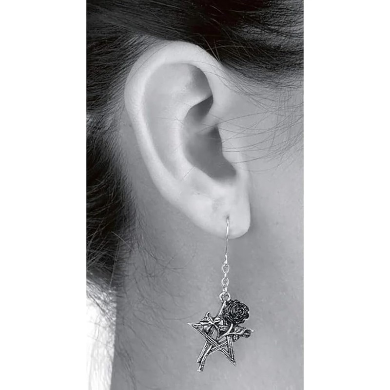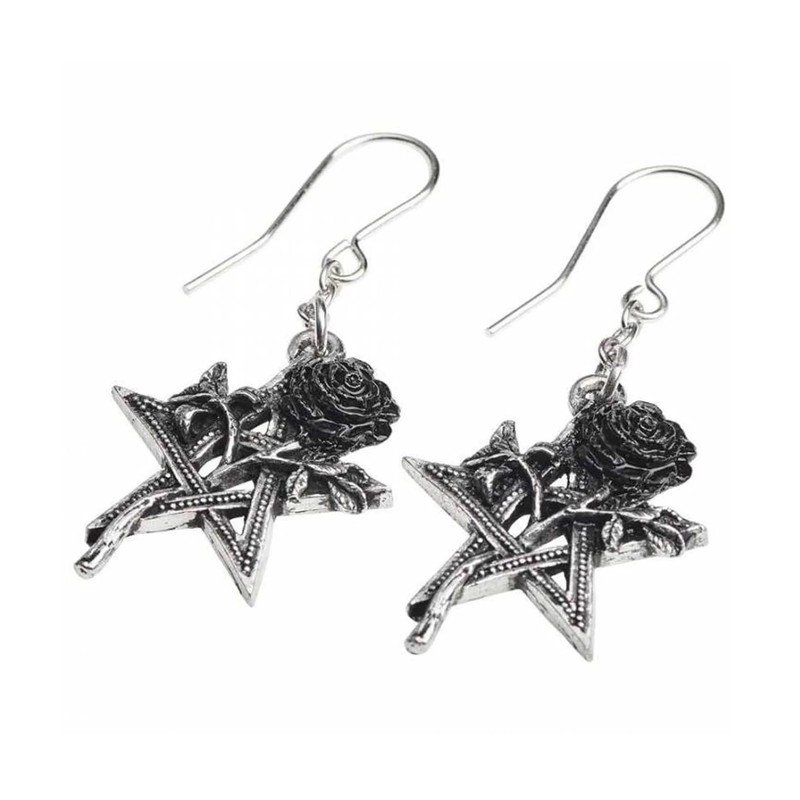Pair of pentagrams, each entwined black petalled rose. Surgical steel drop/ dangle Earrings. Dimensions (approx.):Height: 47mm (1.85") Width: 23mm (0.91") Depth: 5mm (0.20"). Packaged in an Alchemy branded bag, including Alchemy Guarantee and care instructions.