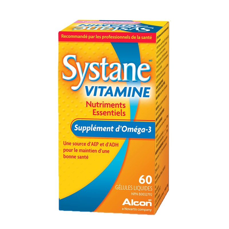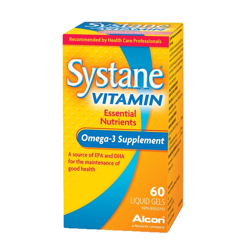 Alcon Systane Vitamin Omega-3 Healthy Tears 60 Softgel Omega-3 essential nutritional oils help promote healthy tears Systane vitamin softgels contains 1000 mg omega-3 fatty acids form highly refined fish oil Utilizes proprietary enteric softgel technology that controls and eliminates the unpleasant aftertaste commonly associated Doctors recommend supplements with omega-3 fatty acids and the antioxidant vitamin e to help promote healthy tears Alcon Systane essential nutrients research has shown that omega-3 essential nutritional oils help promote healthy tears. Each serving of systane vitamin softgels contains 1000 mg omega-3 fatty acids form highly refined fish oil. Systane vitamin utilizes a proprietary enteric softgel technology that controls and eliminates the unpleasant aftertaste commonly associated with fish oil-based omega-3 supplements. Doctors recommend supplements with omega-3 fatty acids and the antioxidant vitamin E to help promote healthy tears. Safety Warning Softgels should be consumed whole. Do not consume damaged softgels. If you are taking prescription medications or are being treated for a medical condition, you should consultyour healthcare professional before taking this or any dietary supplements.