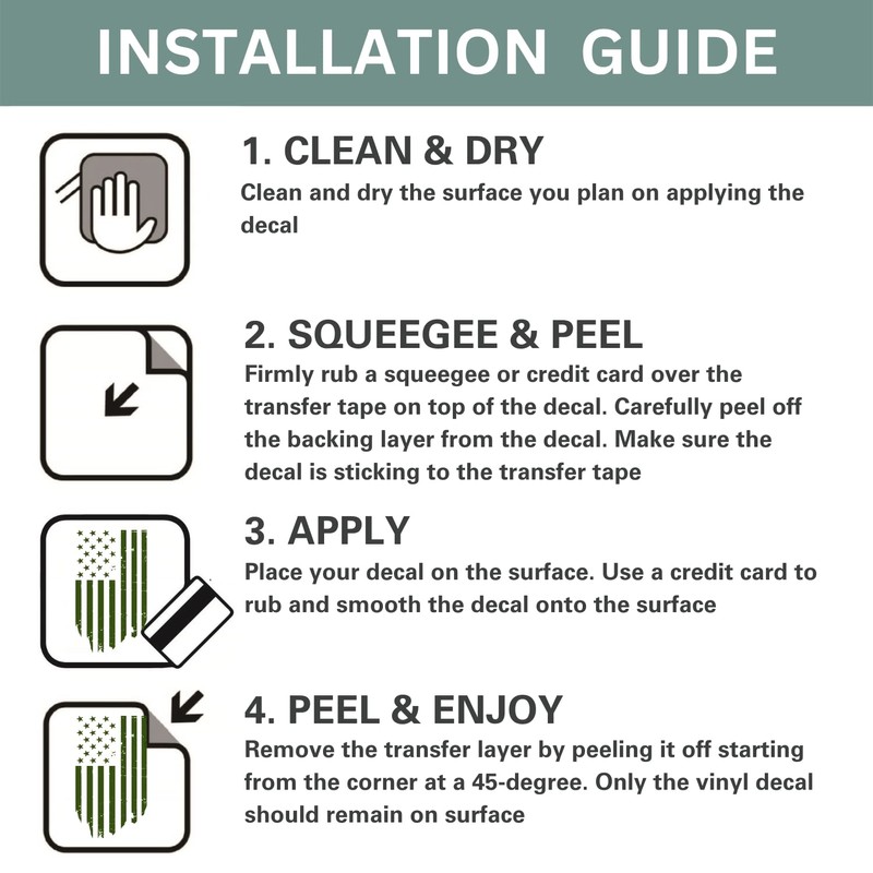 - Easy to install and removal: do-it-yourself installation. Just follow step-by-step the provided installation guide. High-quality clear transfer tape is applied on the top of the graphic for better and easier installation. Easily removable and will not leave behind a sticky residue or damage the car surface.