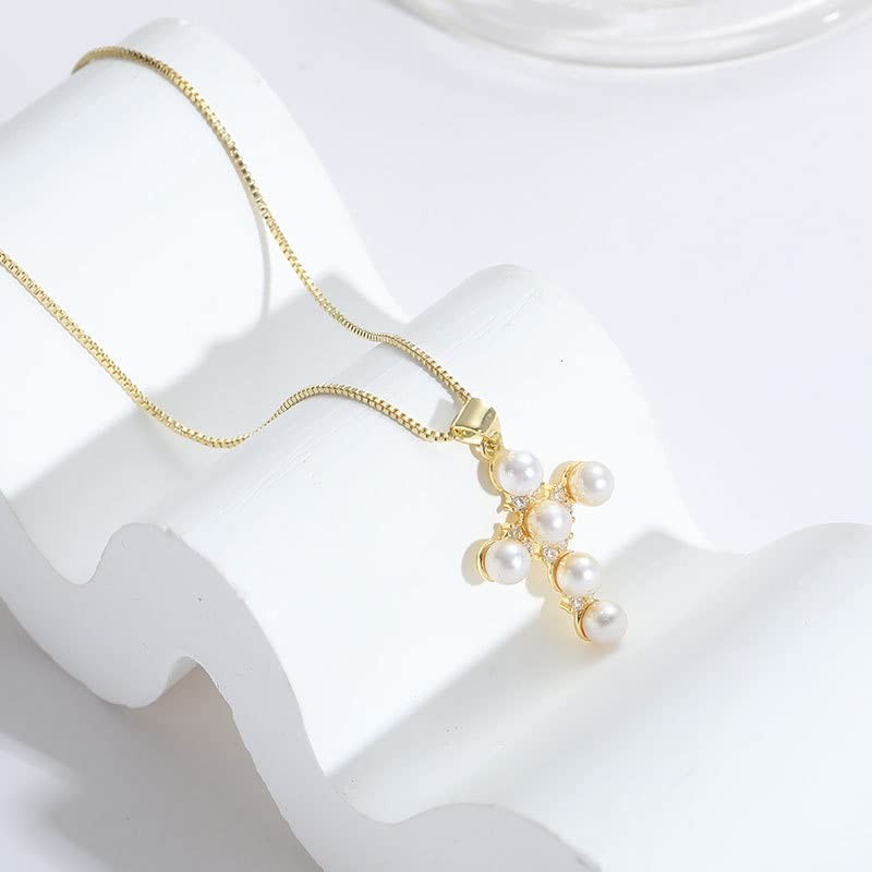 - Product details: cross pearl necklace length: 45 + 5 cm. Cross pendant: 1.8 x 2.5 cm. Material: high-quality artificial pearls and stainless steel, 5A level technology with 14k real gold. Exquisite polished, comfortable to wear, large coating and durable.