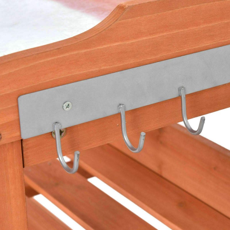 - 【THOUGHTFUL DESIGN】: This gardening potting bench is equipped with extra iron hooks, feel free to hang your handy gardening tools, water pipes or mobs on them. The hooks are made of iron and screw to the surface wood tightly, it is suggest to hang relatively less heavier stuff on them.