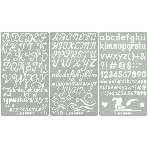 Aleks Melnyk #34 Pyrography Stencils, Wood Burning kit 3 PCS Templates, Metal Letters Stencil for Engraving Wood and Patterns, Alphabet and Number, Lettering, Letting, Stainless Steel Journal Stencils