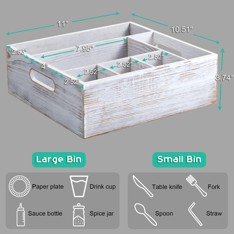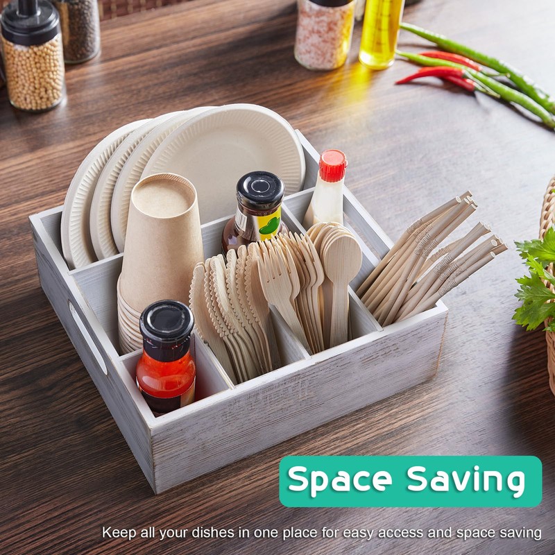 ALELION Rustic White Utensil Holder for Party - Paper Plate Organizer for Countertop - Silverware Caddy with 6 Compartments for Plate Cup Fork Spoon - Cutlery Holder for Camping Buffet