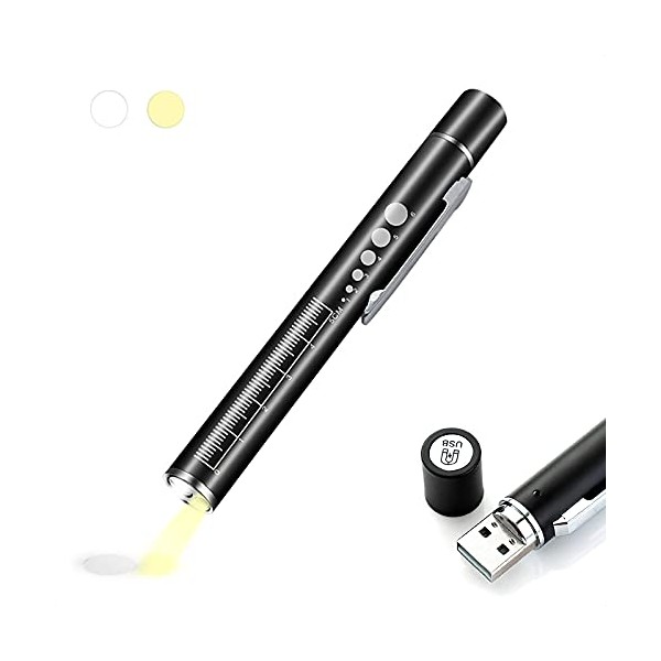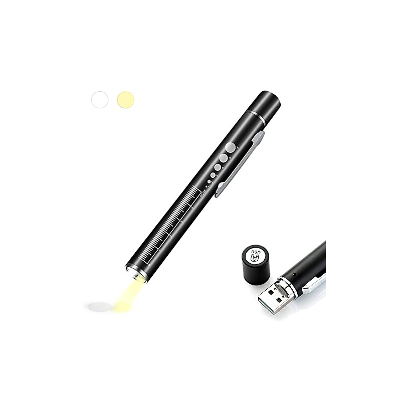 ALEOED USB Rechargeable Pen Light Black Reusable LED Penlight for Students Doctors Nurses with 2 Light LED Sources, Extra Warm Light Bulb, Pocket Clip