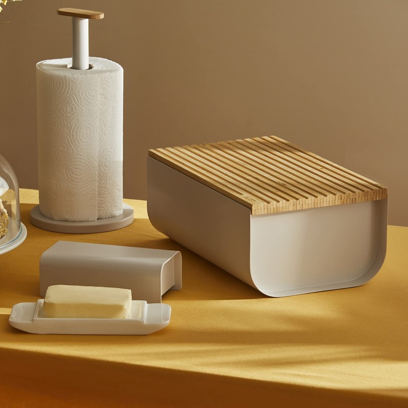 Alessi BG03 WG Mattina Bread Box in Steel Coloured with epoxy Resin with Cutting Board in Bamboo Wood, One Size, Warm Grey