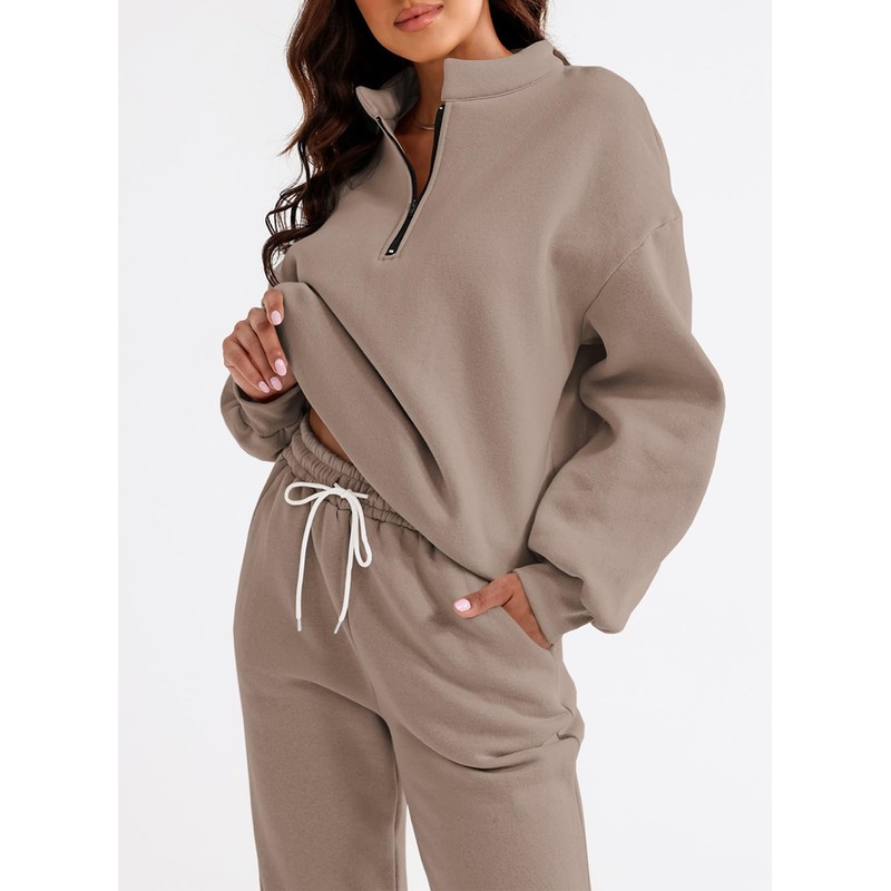 Aleumdr Womens 2 Piece Outfits Half Zip Pullover Long Sleeve Sweatshirt Jogger Pants Lounge Sets Sweatsuit with Pockets Simply Taupe Medium