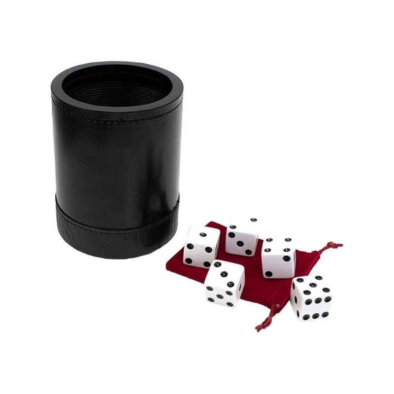Alex Cramer Big Al Extra Large Dice Shaker Cup (5" x 4") Set - 5 Large 1" White Dice, Drawstring Pouch & Book of Dice Games (Liar’s Dice) Included - Leather Dice Cup - Quiet Shaking.