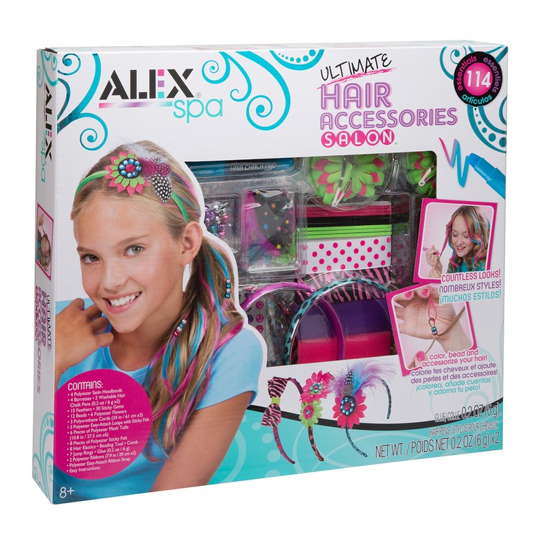 ALEX Spa Ultimate Hair Accessories Salon includes everything your child needs to color, bead and accessorize her hair! Make 8 awesome accessories like headbands and hairclips. Hair chalk pens can be used to add streaks of color and easily wash out later! Great for sleepovers, birthday parties or just a girl's night in. Includes 4 headbands, 4 barrettes, 2 washable hair chalk pens (0.2oz.), 3 cords (24in.), 15 feathers, 30 sticky gems, 12 beads, 6 fabric flowers, 8 pieces of sticky felt, 8 hair elastics, beading tool, comb, 7 jump rings, tulle (10.8in. x 6in.), ribbon (7.9in.), easy-attach ribbon strap, glue (0.2oz.) and easy instructions. Recommended for children 8 years of age and older.