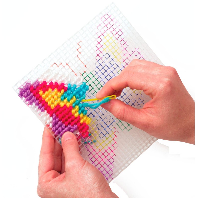 - Includes pre printed plastic canvas, plastic frame, 44 pieces of yarn, plastic needle and easy instructions