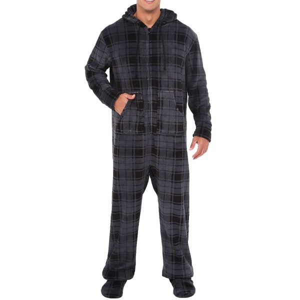 Alexander Del Rossa Adult Onesies for Men, Mens Onesie Pajamas Adults, Fleece Onesie for Men, Hooded Footed Mens Onsie Gray Plaid XL (A0320R40XL)