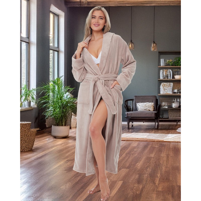 - THICKER - 2 times thicker than average fleece robe for women bathrobe. Hooded Bath robes female with male versions also available. The ideal, stylish housecoats for women for Fall and Winter. Size medium, rose taupe blush pink robe by Alexander del Rossa.