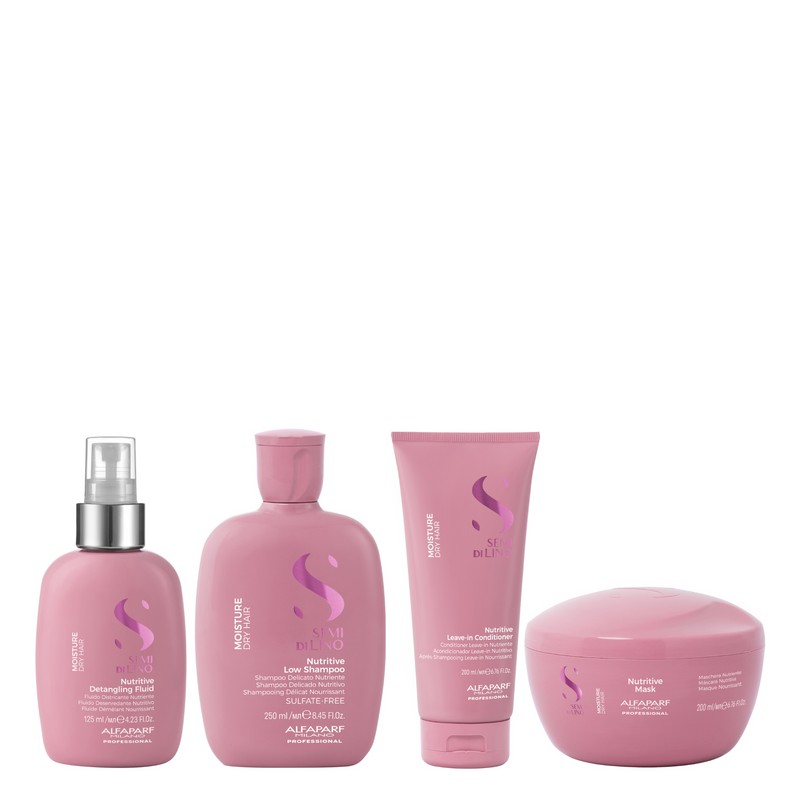 The Alfaparf Milano Semi Di Lino Moisture Complete Quad Bundle is a comprehensive hair care set designed to nourish and hydrate your hair. This bundle is perfect for those seeking to revitalize and maintain the moisture balance of their hair. The Alfaparf Milano Semi Di Lino Moisture Complete Quad Bundle includes four essential products that work together to detangle, cleanse, condition, and deeply nourish your hair. Each product is formulated with high-quality ingredients to ensure your hair remains healthy, shiny, and manageable. What is included in Alfaparf Milano Semi Di Lino Moisture Complete Quad Bundle? • Semi Di Lino Moisture Nutritive Detangling Fluid 125ml • Semi Di Lino Moisture Nutritive Low Shampoo 250ml • Semi Di Lino Moisture Nutritive Leave-In Conditioner 200ml • Semi Di Lino Moisture Nutritive Mask 200ml What are the features and benefits of Alfaparf Milano Semi Di Lino Moisture Complete Quad Bundle? Semi Di Lino Moisture Nutritive Detangling Fluid: This fluid helps to effortlessly detangle your hair, reducing breakage and making it easier to manage. It provides a lightweight layer of moisture, leaving your hair soft and smooth. Semi Di Lino Moisture Nutritive Low Shampoo: A gentle cleansing shampoo that effectively removes impurities while maintaining the natural moisture balance of your hair. It leaves your hair feeling clean, refreshed, and hydrated. Semi Di Lino Moisture Nutritive Leave-In Conditioner: This leave-in conditioner provides continuous hydration throughout the day, protecting your hair from environmental stressors and keeping it silky and manageable. Semi Di Lino Moisture Nutritive Mask: A deeply nourishing mask that penetrates the hair shaft to deliver intense moisture and repair. It revitalizes dry, damaged hair, restoring its natural shine and elasticity. Who is Alfaparf Milano Semi Di Lino Moisture Complete Quad Bundle for? This product is for anyone looking to enhance the moisture and health of their hair, particularly those with dry or damaged hair.