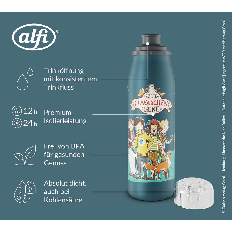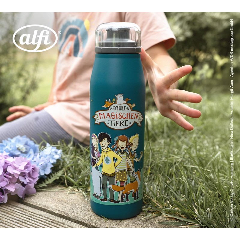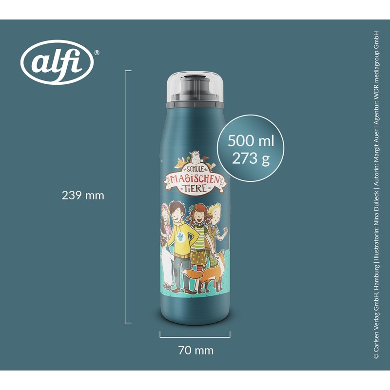 alfi Kids ISO Bottle 500 ml, Blue - School of Magic Animals, Insulated Drinking Bottle Children's Stainless Steel, Tight with Screw Cap, Keeps Hot for 12 Hours, Cold for 24 Hours, Drinking Bottle for