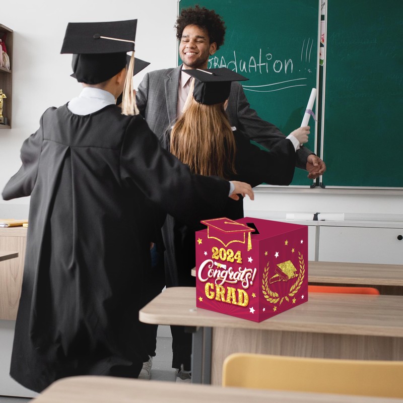 - 【Congrats Grad 2024 Card Box】This is a card box that features graduation cap, diploma scrolls, ‘congrats grad’ blessing, stars and other graduation imagery. The four sides of this card box have different patterns which looks vibrant and meaningful. Made of thick cardstock paper, the graduation card holder box is durable and can hold many cards. That’s perfect for your graduation party!
