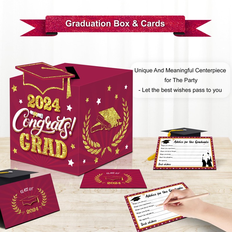 - 【What You Will Get】1 x Decorative Grad Card Box measures 7.9 x 7.9 x 7.9 Inches. 36PCS Graduation Wish Cards measures 5.5 x 4 inches. Congrats Grad Card Box can be used as a wonderful decoration for your graduation party. Grad Wish cards allow guests to write their wishes for you! Perfect supplies for your 2024 Graduation Party!