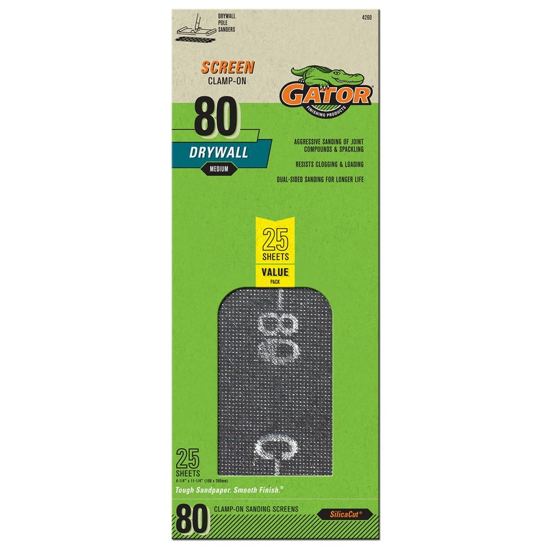 Gator Grit 25 Count 4-1/4" x 11-1/4" 80 Grit Coarse Sanding Screen. Sanding screen is pre-cut to fit pole sanders and can be used wet or dry. The sanding screen is the ideal abrasive product to use to sand and feather drywall joint compounds and spackling to prepare wall surfaces for painting. It can also be used for scuffing painted walks before you repaint them. The screen is designed with an open mesh to allow dust and particles to pass through and reduce clogging. With its dual sided abrasive surfaces, you can turn the sheet over to have a new cutting surface. You can also rinse clean the screen to give the screen an even longer life.