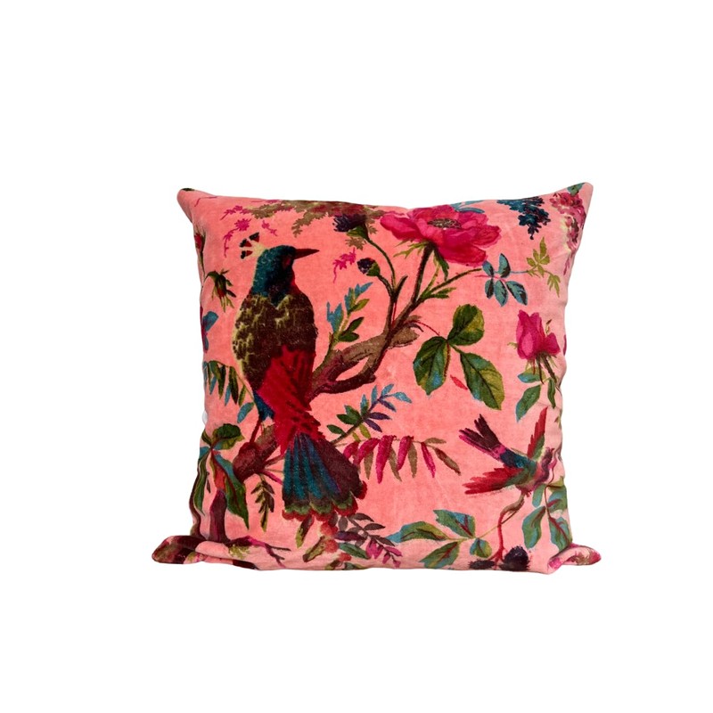 Alia Enterprises Velvet Floral Bird Print Throw Pillow Sofa Cushion Cover Case | Couch Bohemian Accent | Colorful Boho Chic Indian Handmade Cover Only (Peach, 20" X 20")