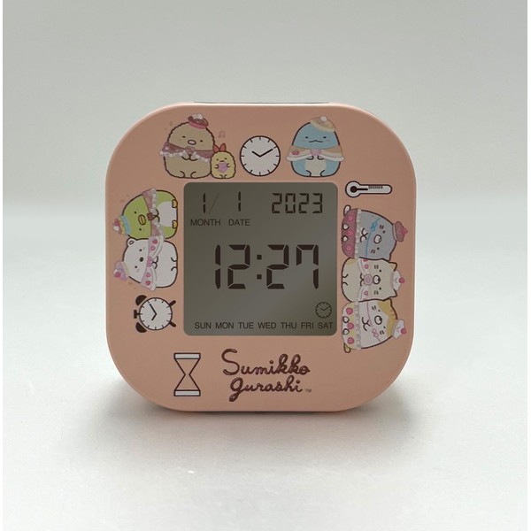 Sumikko Gurashi rotating multi-function clock. In addition to the day and time display, you can switch between 4 functions, including room temperature, timer, and alarm. The LCD screen has illustrations of Sumikko Gurashi and icons representing each function, so you can feel the functionality and adorable world of Sumikko Gurashi with each use. It also has a backlit LCD function that alternates between blue and green illumination with each function screen by rotating the main unit. The packaging also has the same world view as the main unit, so it is recommended as a gift for new school entrance or birthdays. Product Size (H x W x D): Approx. 3.0 x 3.0 x 1.5 inches (7.6 x 7.6 x 3.8 cm); Weight: Approx. 2.2 oz (64 g).