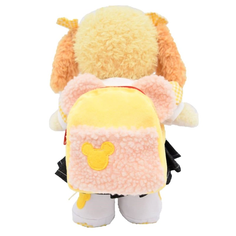 - Set includes 7 parts: 2 head ribbons, blouse, overalls skirt, drawers, sneakers, fluffy backpack