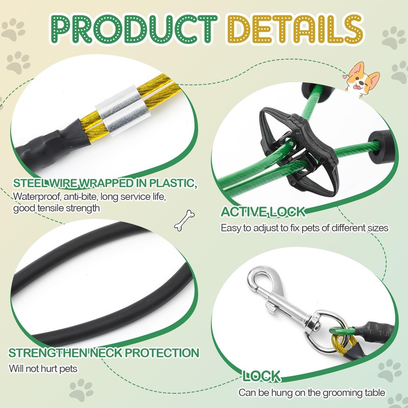 - Durable Material: dog grooming harness is crafted from steel wire core and rubber coated surface, ensures that it is not easily damaged during long-term use; Double-bound plastic coated steel wire rope has good tensile strength, waterproof, bite-proof and rust-resistant, and movable lock could reinforce neck protection, comfortable for pets