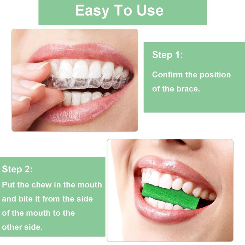 - 【Easy to Use】Step 1: Adjust and press the aligner. Step 2: Bite the chewie from left to right with your teeth. Step 3: Clean the chewies after use.
