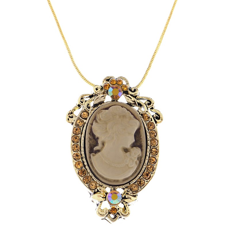 Alilang Golden Tone Shiny Topaz Crystal Rhinestones Vintage Inspired Cameo Lady Pendent Necklace