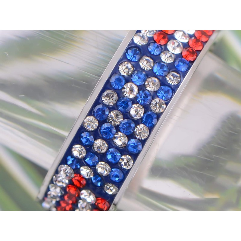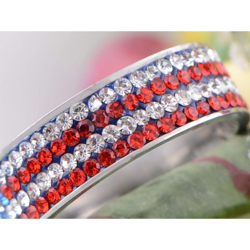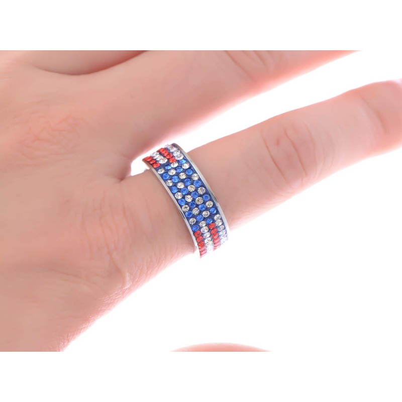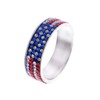 - American flag design ring band. engraved design with red & blue epoxy color and this ring features blue, red and clear rhinestones, sparkly and charm. show off your pride for america, the home of the brave and land of the free with this patriotic ring.
