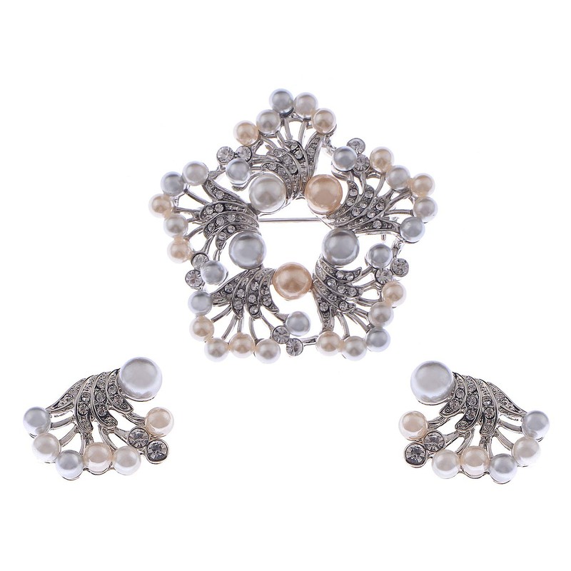 - Vintage inspired design - dripping with faux pearls and jewels this ornate jewelry set will make you shiny for every occasion. Featuring multi colored faux pearl embellishments and studded with clear rhinestone crystals on the floral brooch and matching stud leaf earrings.