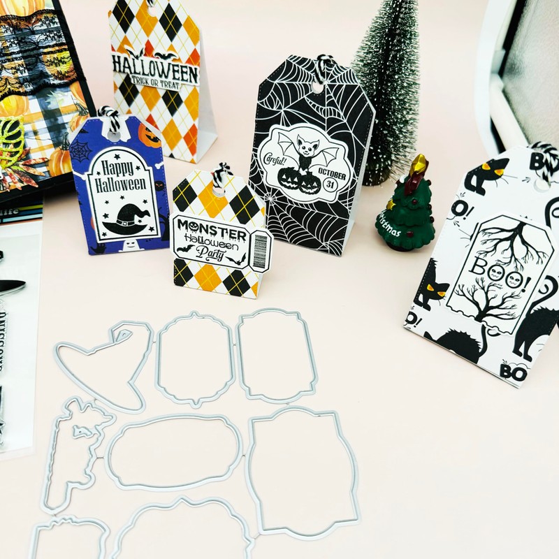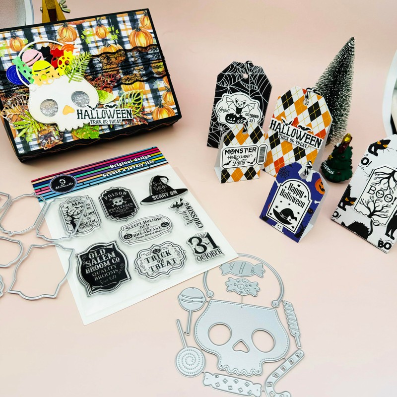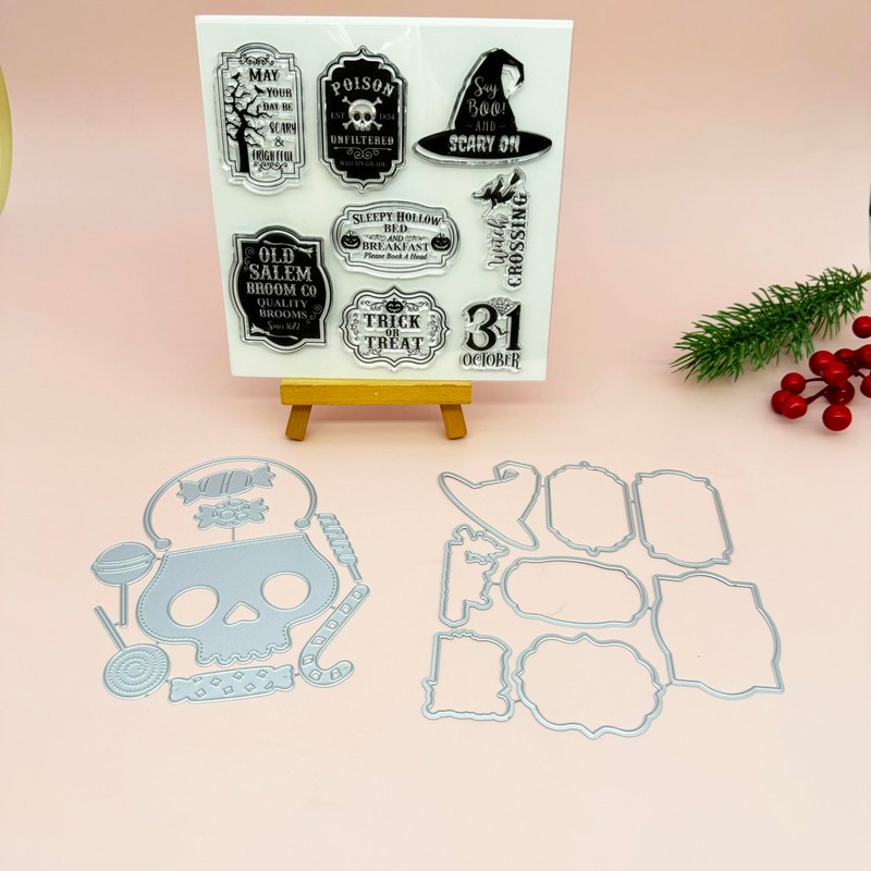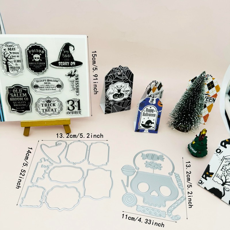 - SENTIMENTS CLEAR STAMPS and TAG DIE SET - Including 1PC Halloween Stamp Clear Stamp &1PC Frame Tag Die Cut And 1PC Skull Ghost Stripe Die