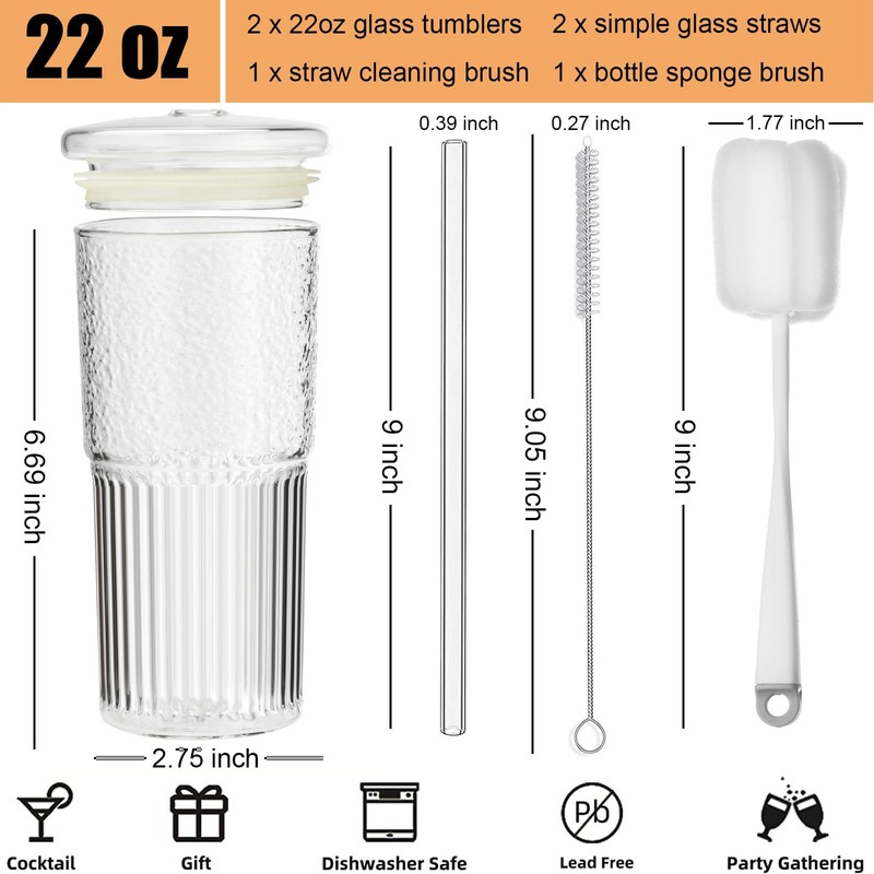 - PRACTICAL & LARGE CAPACITY - With a capacity of 22 oz, glass lids and glass straws, this is perfect for all your favorite drink. High-quality glass can keep original taste of your iced coffee, tea, smoothies, protein shakes. No plastic or metal to affect taste.