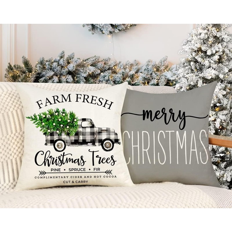 ALINK Christmas Pillow Covers 18x18 Set of 4 Farmhouse Christmas Decorations Merry Christmas Tree Truck Hello Winter Holiday Decor Throw Cushion Cases for Home Couch (Gray)