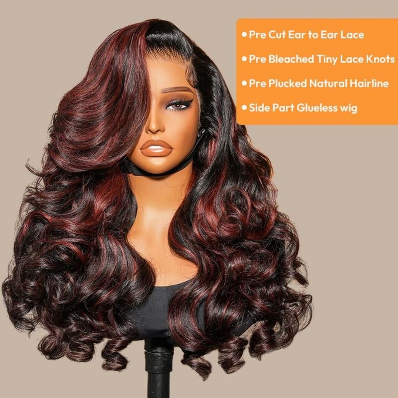- Materials: 1b/99j burgundy highlight wig human hair 13x4 HD lace front wig pre plucked. 100% brazilian side part wig human hair, collect from young girl donors, no shedding and no tangle