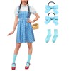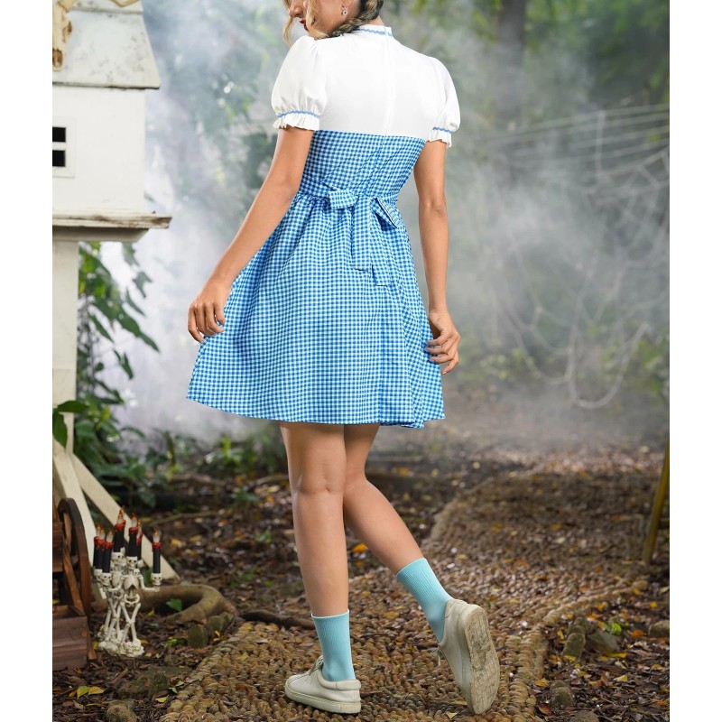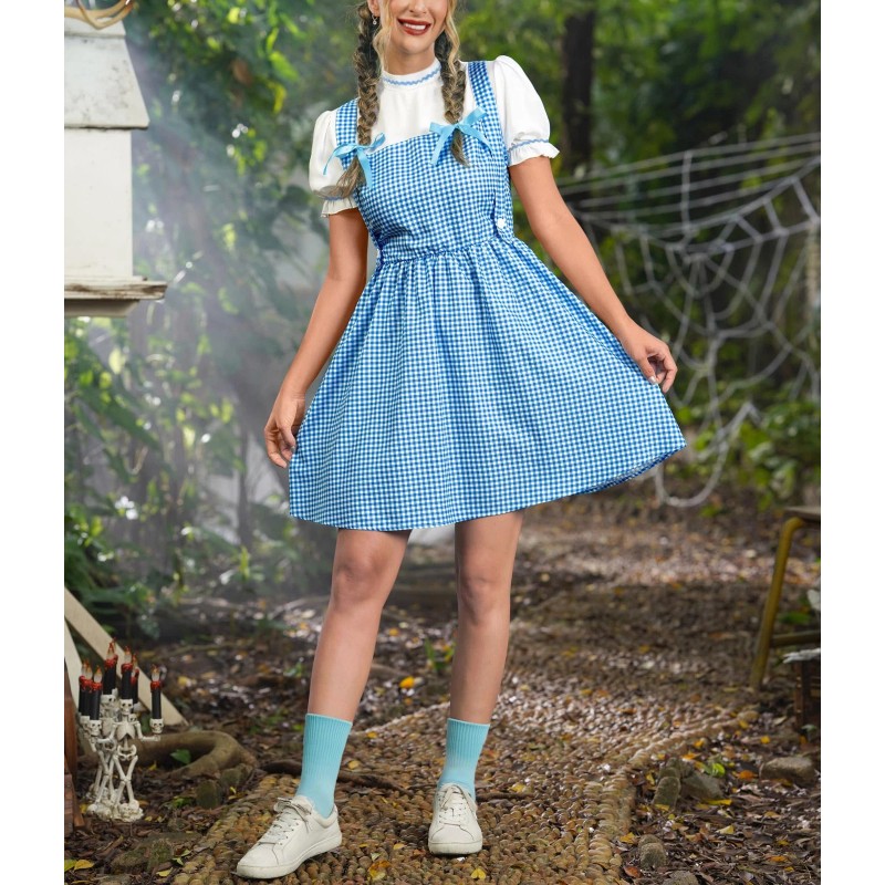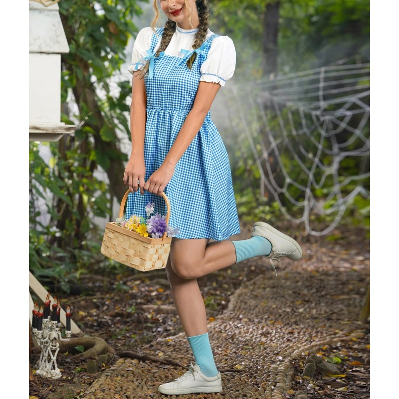 Product Introduction – This set includes a fake two-piece blue and white gingham dress, two blue hair ties and a pair of socks. A fun and playful character look that adds a whimsical touch to your Halloween outfit