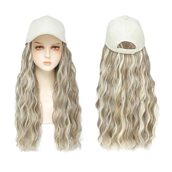 AliRobam Synthetic Wig Hat with Natural Wave hair Extensions attached for woman Baseball cap wig mix blonde white curly wavy Hairstyle Adjustable Beige Hat Wig (MiFAB, 22inch)