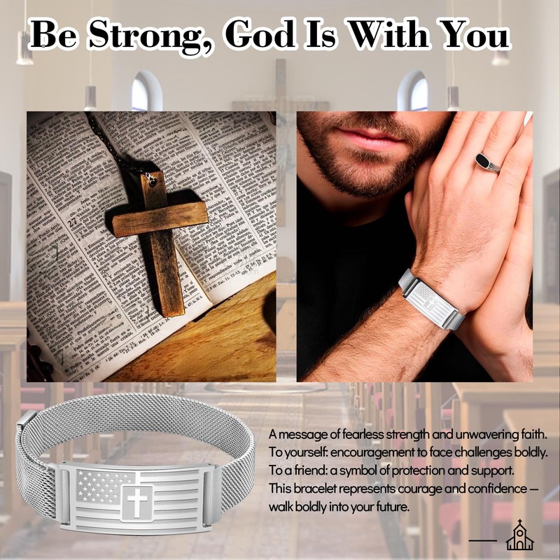 - 【Exquisite Design】: The mens religious bracelets artfully combines Christian faith and patriotism. Its front shows a flag - cross and the back has scriptures, stainless steel bracelets for men revealing the wearer's dual devotion