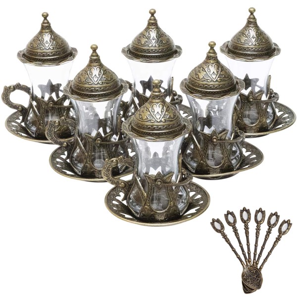 Alisveristime (Set of 6 Handmade Turkish Tea Water Zamzam Serving Set Glasses Saucer and Spoon (Antik Green)