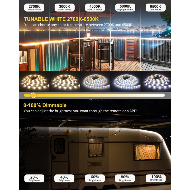 - Tunable white strip light: CCT LED light bars can be freely adjusted between warm and cold white (2700K - 6500K). You can adjust the light colour and brightness to different times or activities and meet different lighting requirements