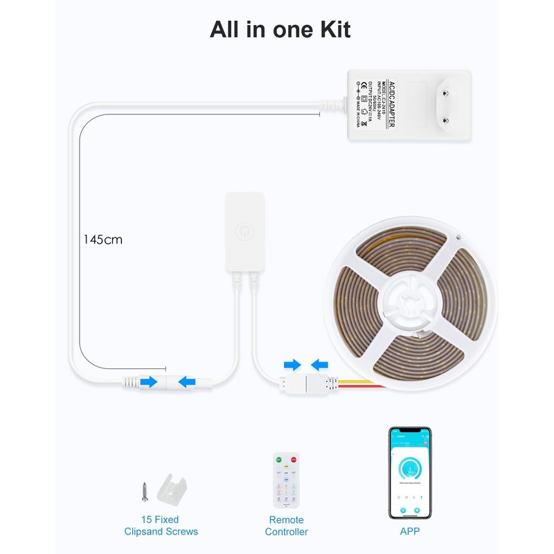 - All-in-one kit: this kit includes 1x 5M LED light bar, 1x 24V power supply, 1x CCT controller and 1x RF remote control. Purchase of additional accessories is not required. It is plug and play capable and installs quickly and conveniently