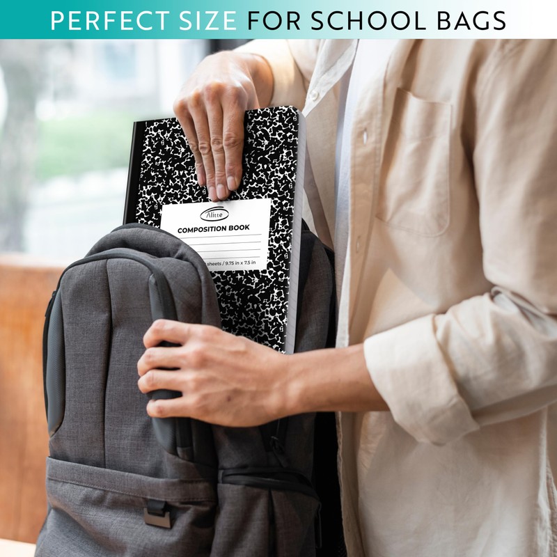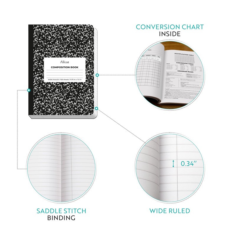 - Smooth, Seamless Writing - Organize journal and college notes with ease. Our thick, wide-ruled composition notebooks have 100 sheets of 9.75x7.5" double-sided paper (total of 200 pages) for notes or sketches.