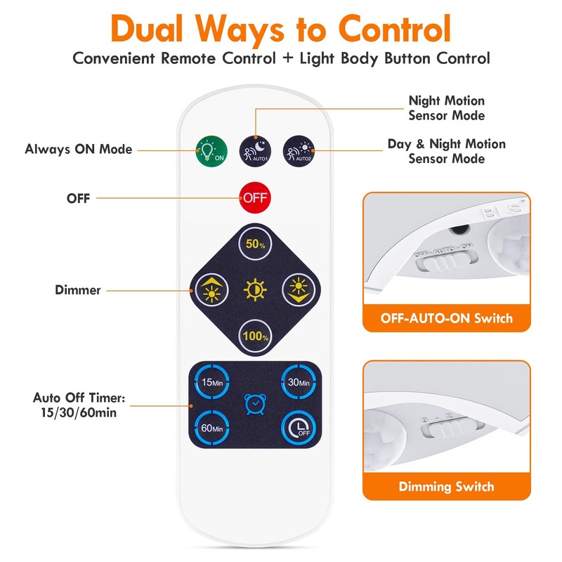 - Closet Light Motion Sensored with Remote: Built-in PIR infrared motion detector with 120 degree detection angle. Battery powered ceiling Light with remote instantly turns on when it detects motion from up to 26 feet away. The upgraded remote control (working distance: 20 ft) allows you to easily turn on / off the battery light, switch among the 3 working modes (ON/AUTO NIGHT/AUTO DAY & NIGHT), dim the light, set the closet light on Auto off timer, etc.
